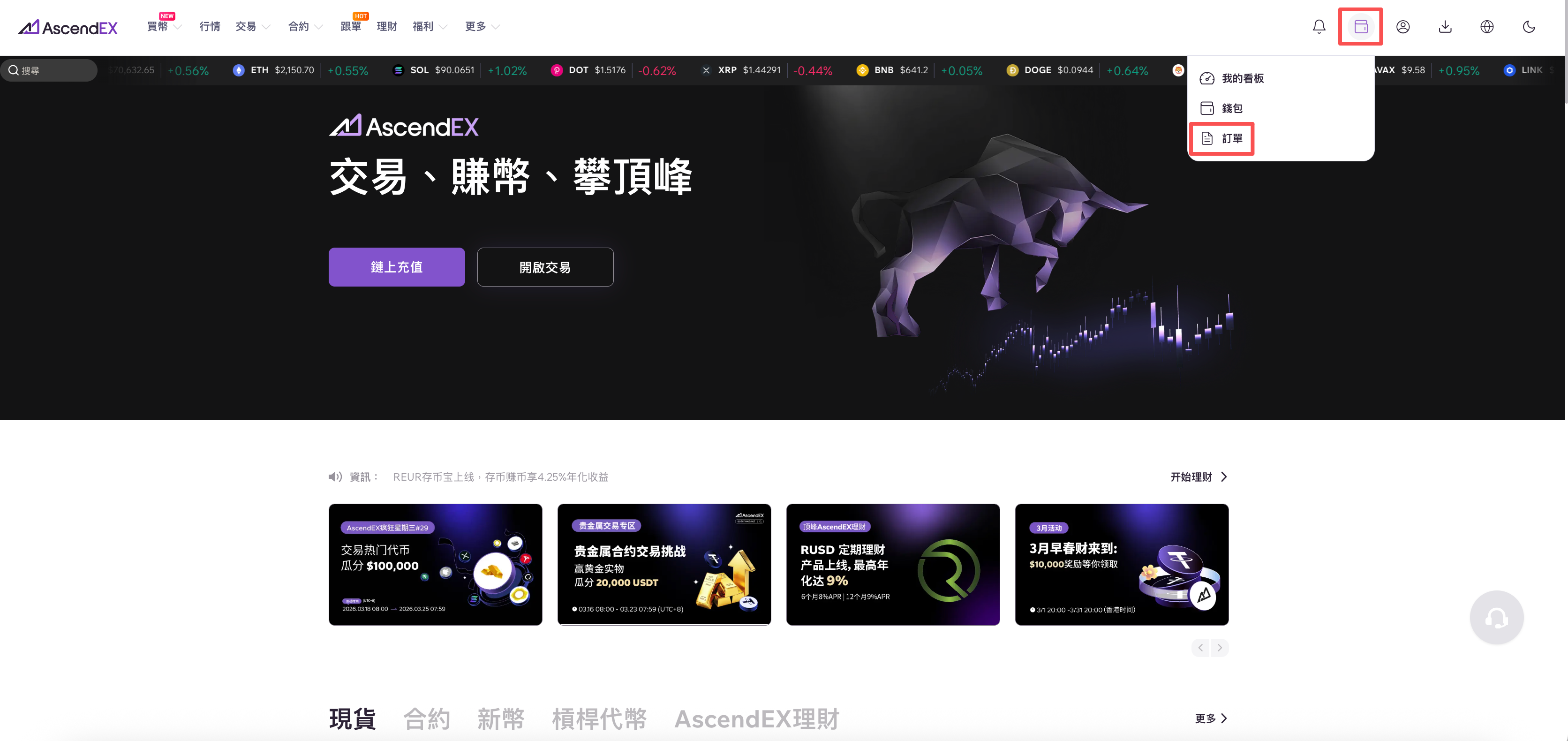 1.打開AscendEX官網,點擊首頁右上方訂單