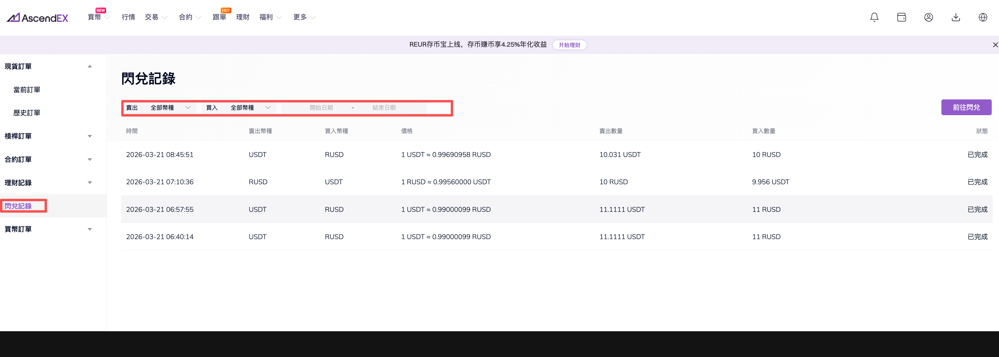 2.進入閃兌記錄歷史訂單頁面,即可查看閃兌買入賣出幣種、價格、數量、狀態資訊。 您還可以點擊篩選查看對應幣種的閃兌記錄。